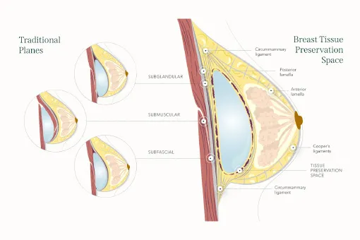 Preservé™(プリザべ)は、患者さまの乳房組織と感覚を維持するようにデザインされた、侵襲性の低い豊胸術です。